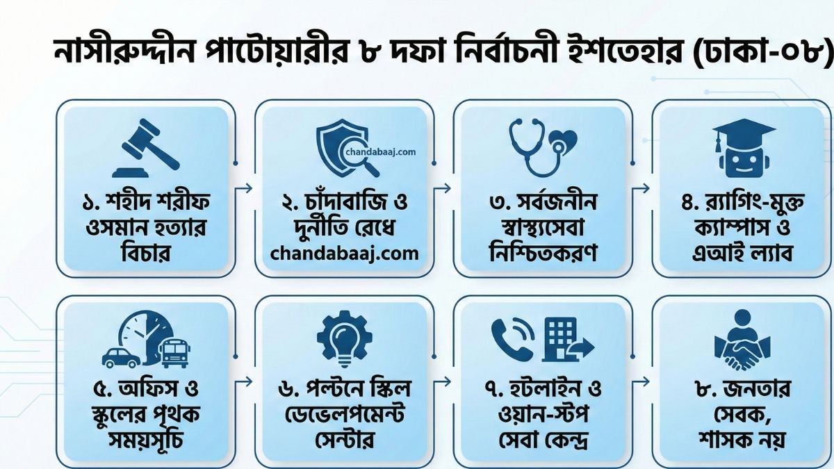 Keywords (Tags): নাসীরুদ্দীন পাটোয়ারী, ৮ দফা ইশতেহার, ঢাকা ৮ নির্বাচন ২০২৬, জাতীয় নাগরিক পার্টি, chandabaaj com, স্মার্ট বাংলাদেশ, নির্বাচনী খবর।