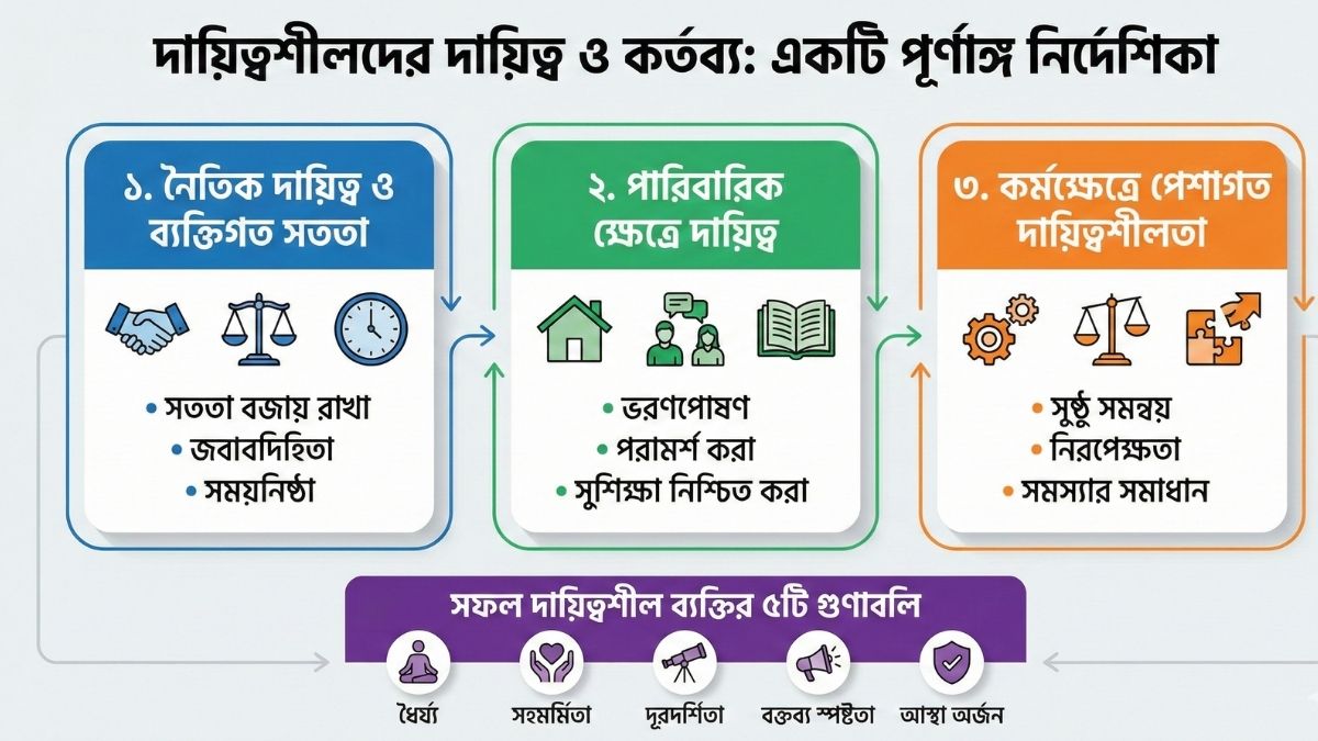 একটি সুন্দর সমাজ ও সুশৃঙ্খল রাষ্ট্র গঠনের মূল ভিত্তি হলো ব্যক্তিগত ও সামাজিক দায়িত্ববোধ। আজকের এই ব্যস্ত সময়ে আমাদের প্রত্যেকেরই নির্দিষ্ট কিছু ভূমিকা পালন করতে হয়। কিন্তু প্রকৃত দায়িত্বশীলদের দায়িত্ব ও কর্তব্য আসলে কী?